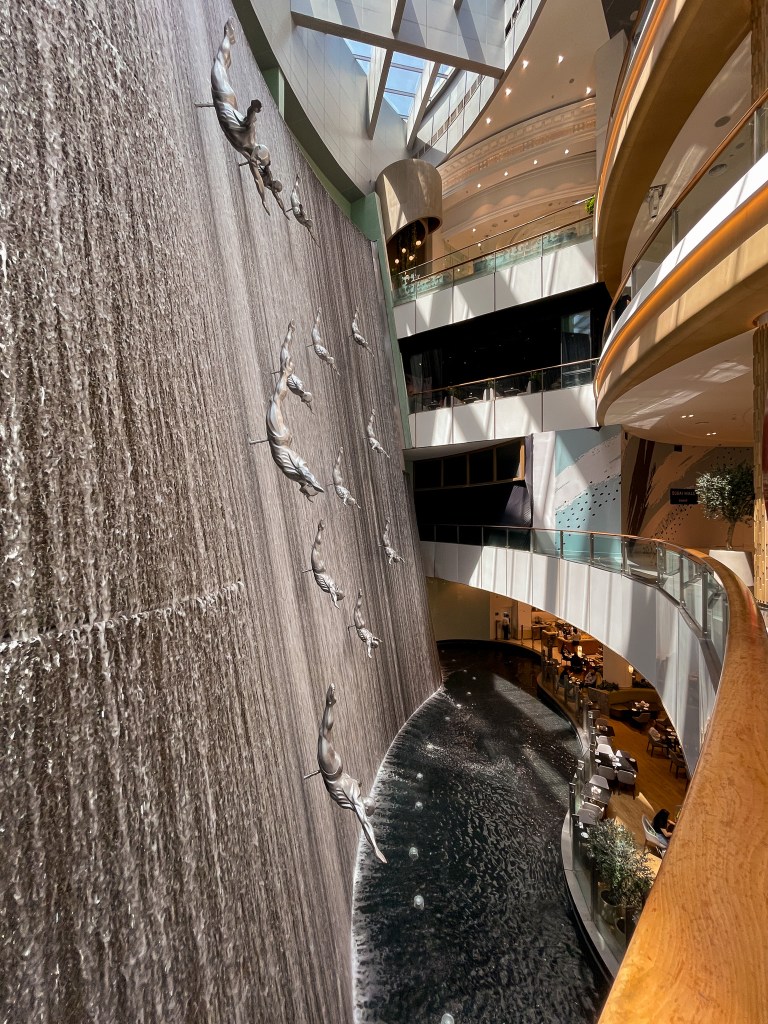 Jeden Abend gibt es bei der Dubai Fountain, direkt vor der Kulisse des Burj Khalifas eine beeindruckende Lichtershow. Start ist ab 18 Uhr, alle halbe Stunde, wobei die einzelnen Shows nur ca. 5 Minuten dauern. Die beste Aussicht, mit weniger Menschenmassen, gibt es direkt vor dem Time Out Market. Hier kann man anschließend auch sehr gut essen gehen, aber günstig ist es nicht.